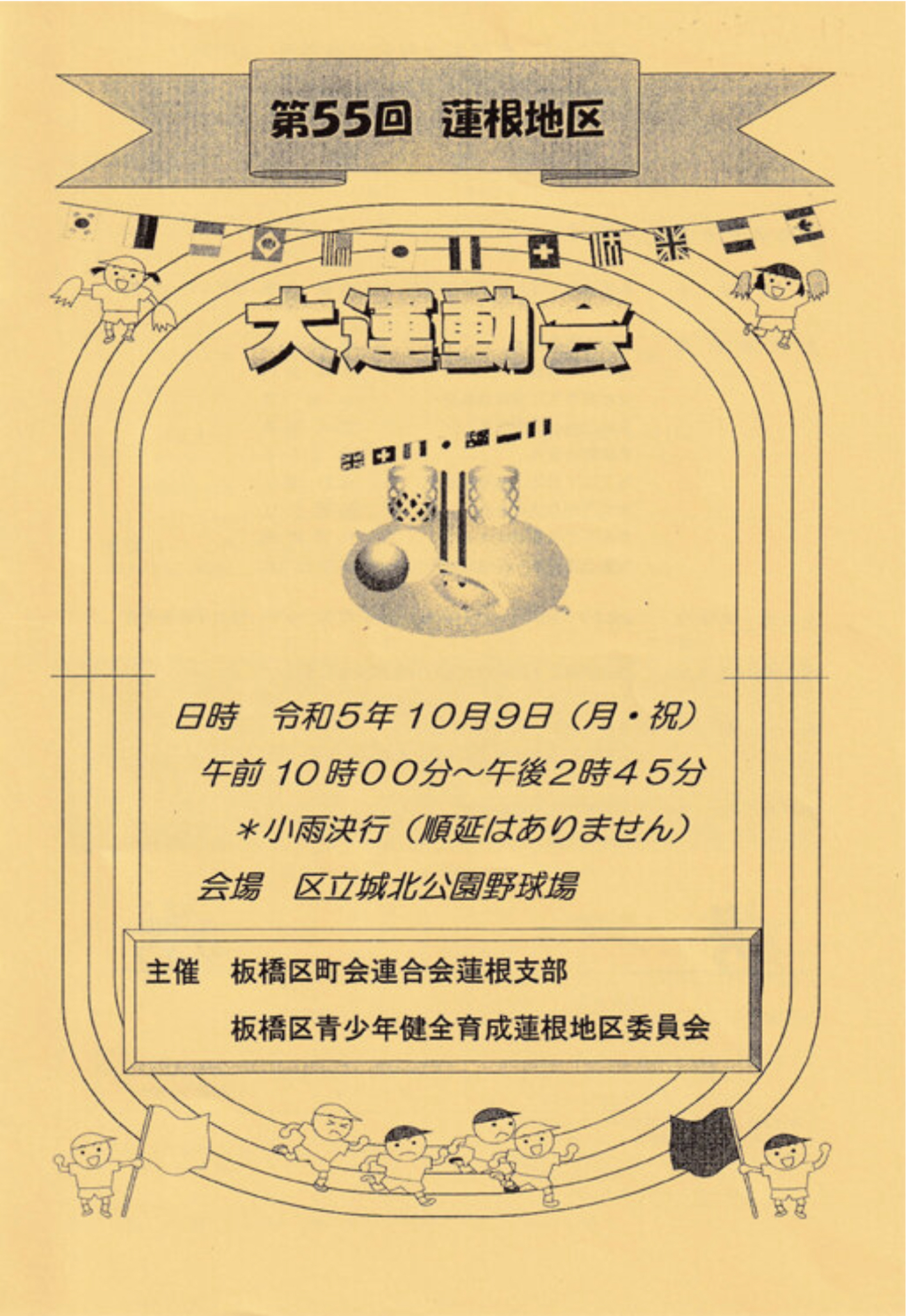 令和5年10月9日(月・祝) 午前10時00分~午後2時45分、区立城北公園野球場におきまして、「第55回蓮根地区大運動会」が板橋区町会連合会蓮根支部と板橋区青少年健全育成蓮根地区委員会の主催で行われます。